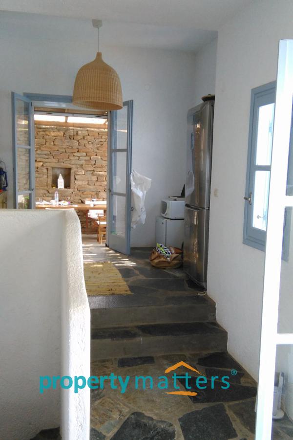 Η μεζονέτα αναπτύσσεται σε δύο επίπεδα. Στον επάνω όροφο, επιφάνειας 68,27 τ.μ., βρίσκεται η κουζίνα, ένας φωτεινός χώρος καθιστικού με τζάκι και ένα wc, όλα διαμορφωμένα με τρόπο που αναδεικνύει την απλότητα και τη γοητεία της κυκλαδίτικης αρχιτεκτονικής. Στο ισόγειο, που καταλαμβάνει 71,05 τ.μ., υπάρχουν τρία υπνοδωμάτια, δύο μπάνια και ένας αποθηκευτικός χώρος, προσφέροντας λειτουργικότητα και ιδανική διαρρύθμιση για φιλοξενία οικογένειας ή επισκεπτών.