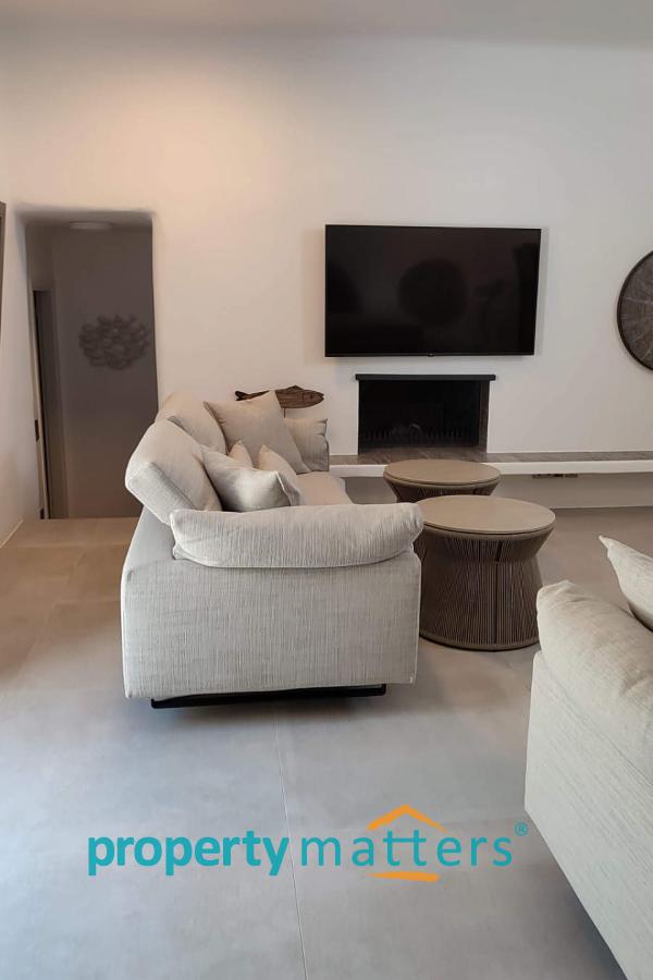 On the main level, an expansive open-plan living and dining area with an impressive fireplace and direct access to the surrounding terraces creates a seamless connection between indoor and outdoor living. A high-spec kitchen, two comfortable bedrooms with en-suite bathrooms, and a guest WC complete this floor, all designed with careful attention to detail, natural light, and functionality. An independent staff room with a private bathroom is also located on the same level.