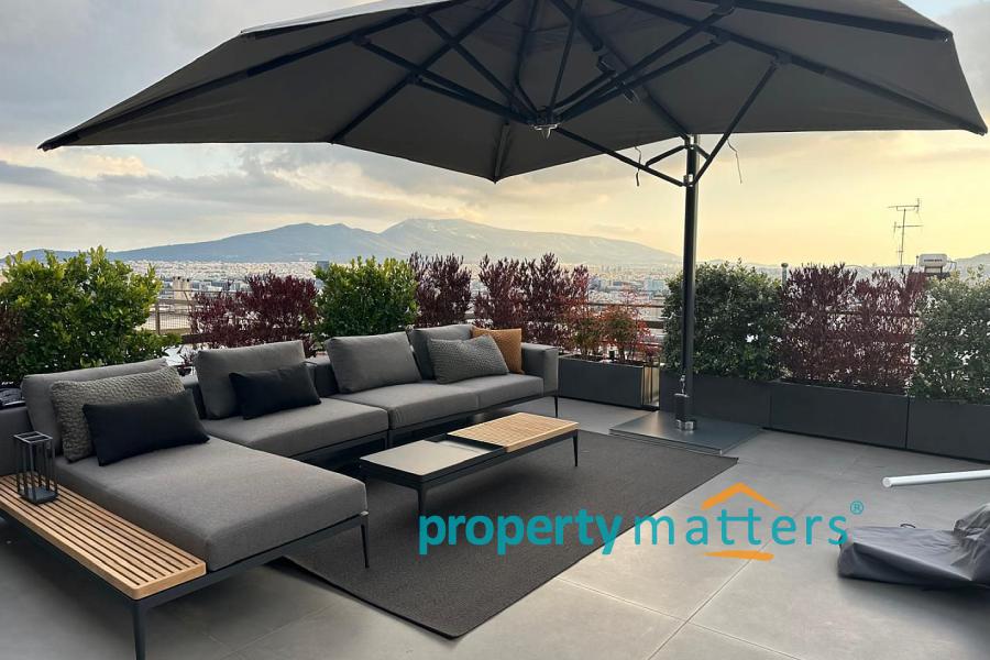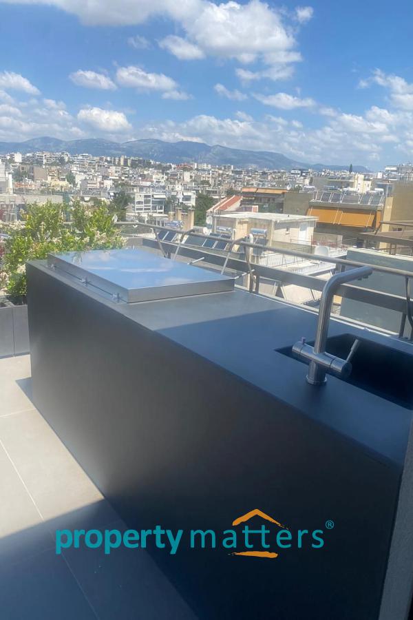 The property includes a 20 m² fully renovated rooftop studio with an exclusive 100 m² terrace, BBQ area, and 360° panoramic views of Athens. Two underground parking spaces and a private storage room are included.